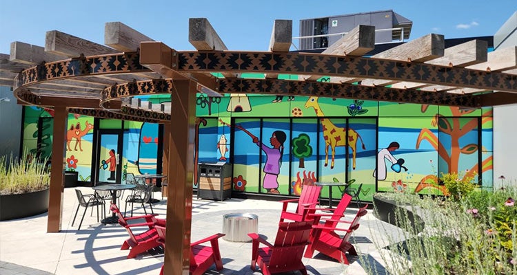This mural is by Indigenous artist Isaac Murdoch, who said: "We're all part of something living and alive that's connected and weaved together, which is this Earth."
